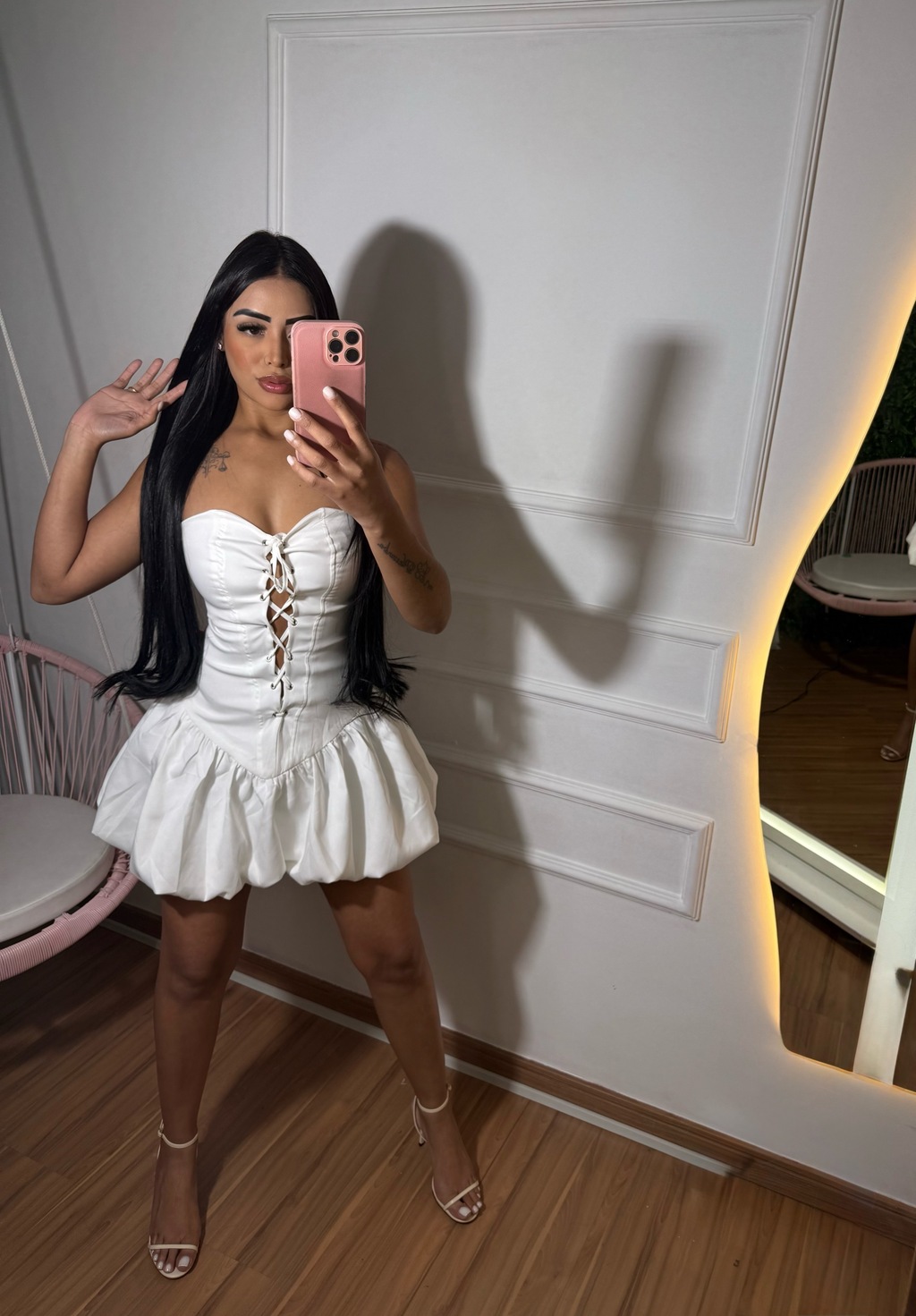 Com decote tomara que caia e detalhe em amarração no busto estilo corset, ele modela o corpo com elegância. A saia balonê dá um toque romântico e fashionista ao look.
