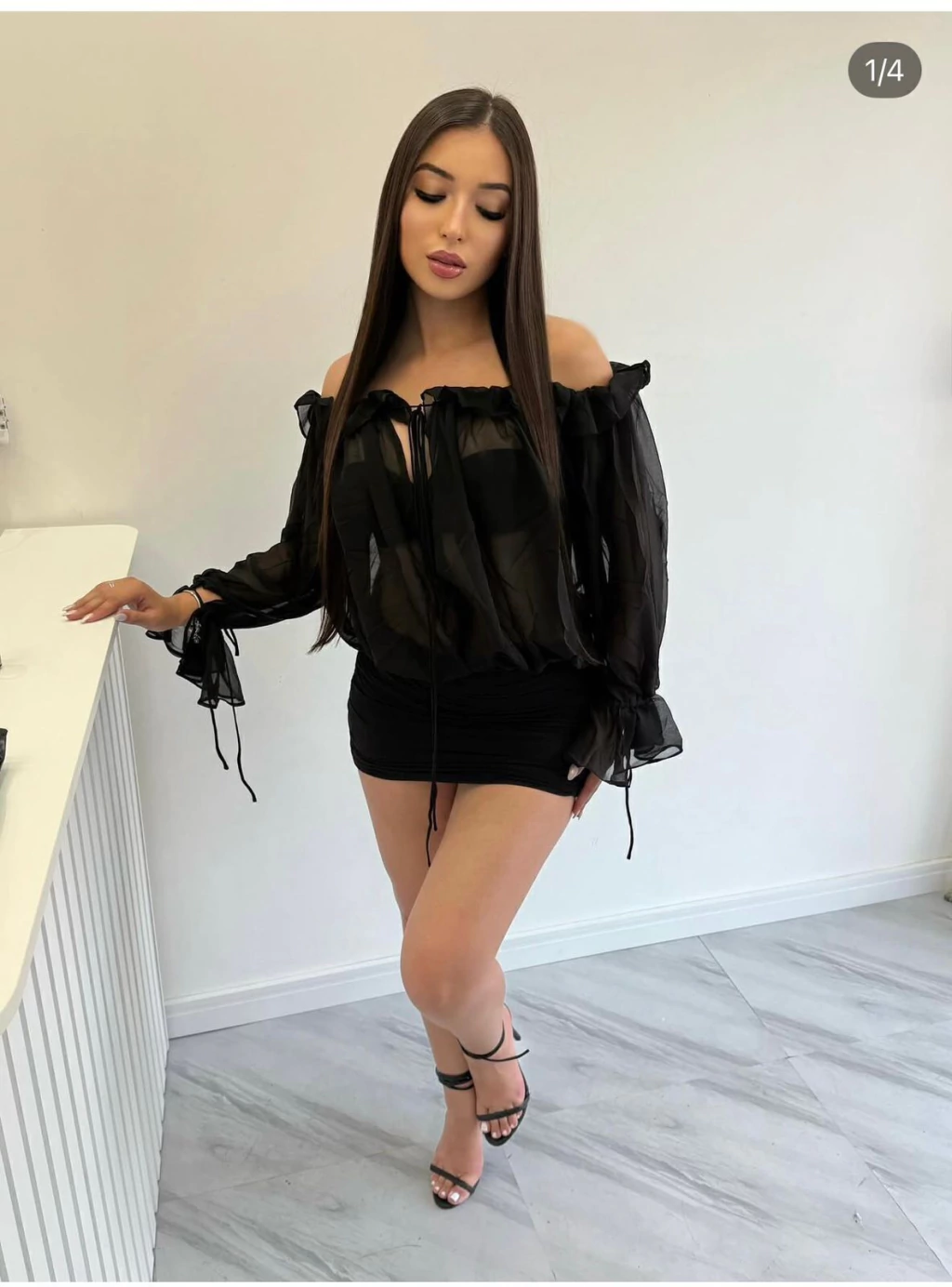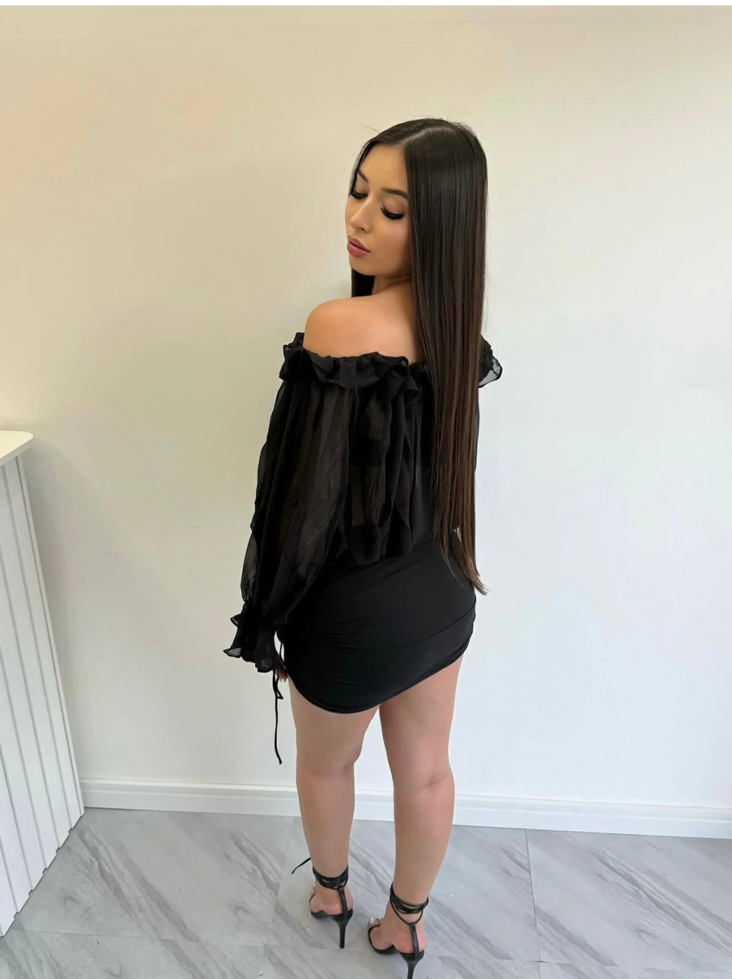 Descubra a combinação perfeita de elegância e modernidade! Este vestido curto destaca-se pelas mangas longas em tule transparente, que conferem um toque sofisticado e delicado. Seu caimento justo valoriza as curvas, realçando a silhueta com charme e sensualidade.